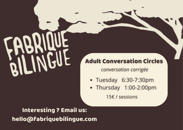 Envoyez un e-mail à hello@fabriquebilingue.com pour en savoir plus sur les cercles de langues ou conversations corrigées pour adultes. Merci d’y inclure vos disponibilités ainsi que votre niveau d’anglais actuel estimé.